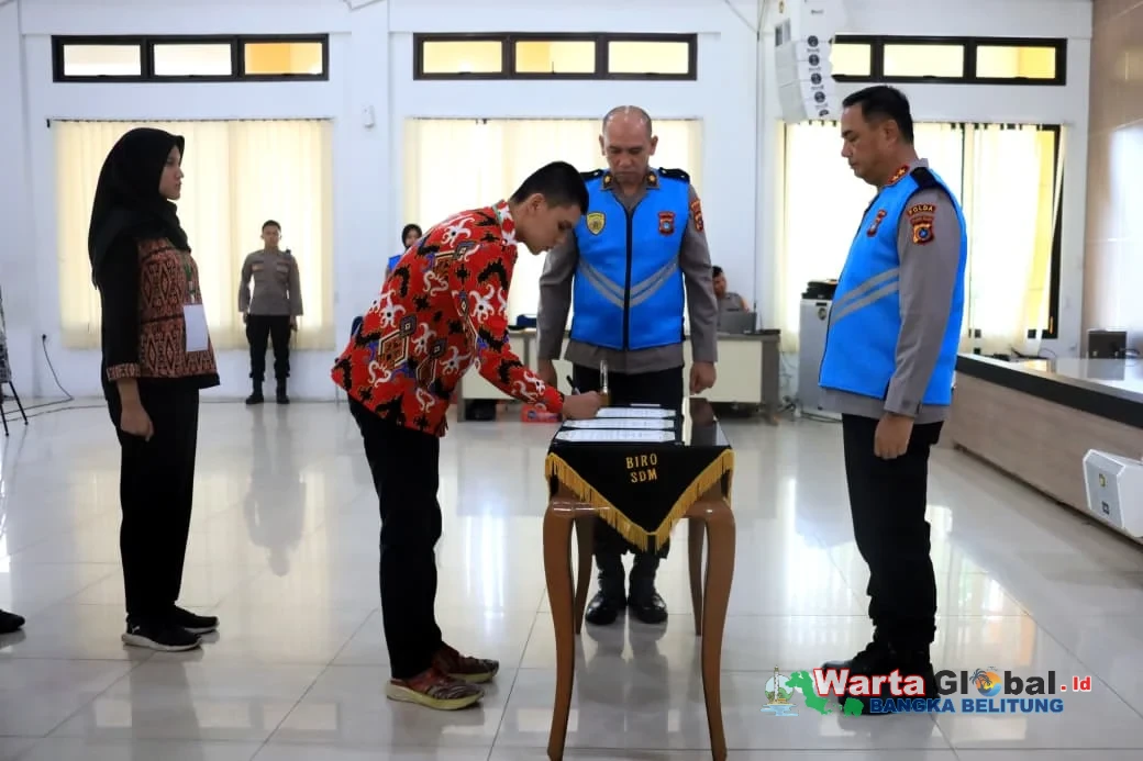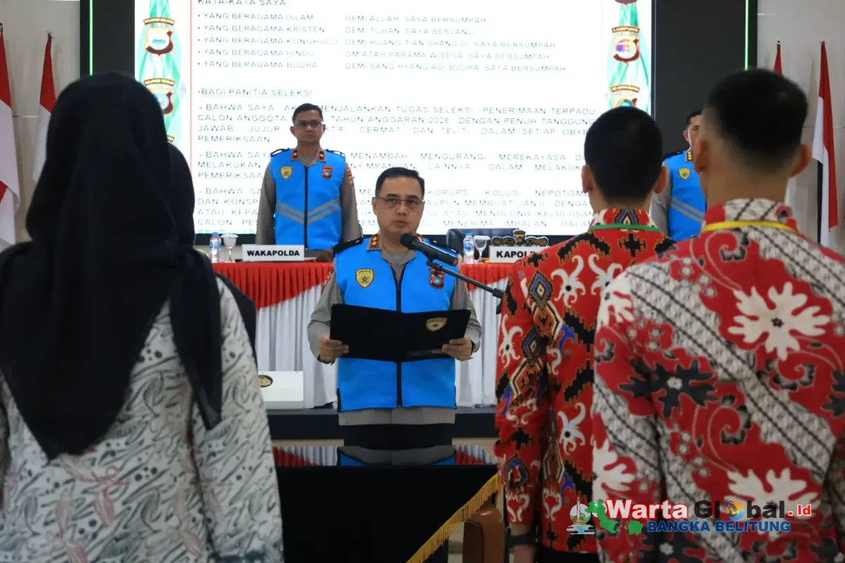 Wartaglobalbabel.id, Polda Bangka Belitung menggelar penandatanganan Pakta Integritas serta pengambilan sumpah seleksi penerimaan terpadu calon anggota Polri tahun anggaran 2026 di Gedung Tribrata, Selasa (31/3/26).
